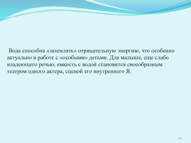 Слайд 24 Вода способна «заземлять» отрицательную энергию, что особенно актуально в работе с