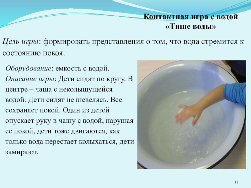 Слайд 11Контактная игра с водой «Тише воды»