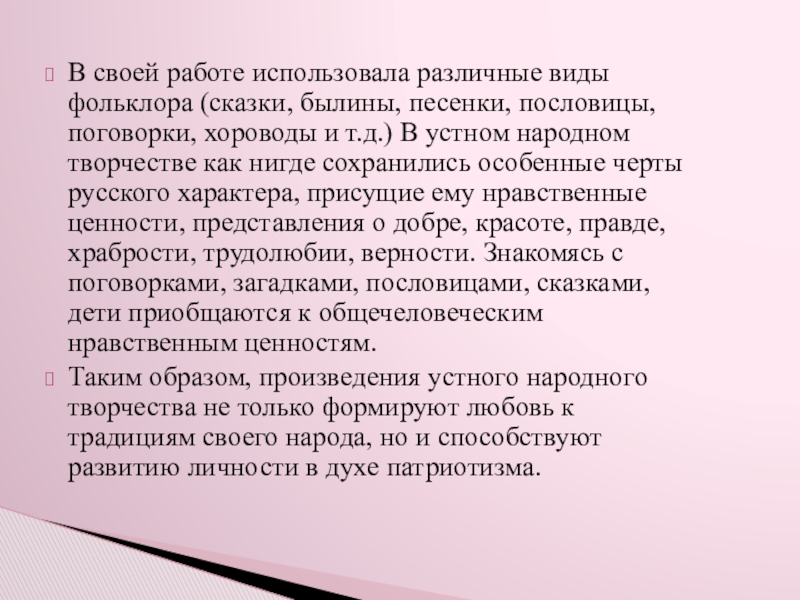Слайд 9В своей работе использовала различные виды фольклора (сказки, былины, песенки, пословицы,