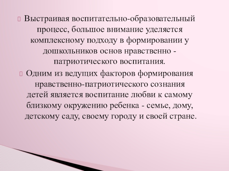 Одним из ведущих факторов формирования нравственно-патриотического сознания детей является воспитание любви к самому близкому окружению ребенка - семье, дому, детскому саду, своему городу и своей стране.
