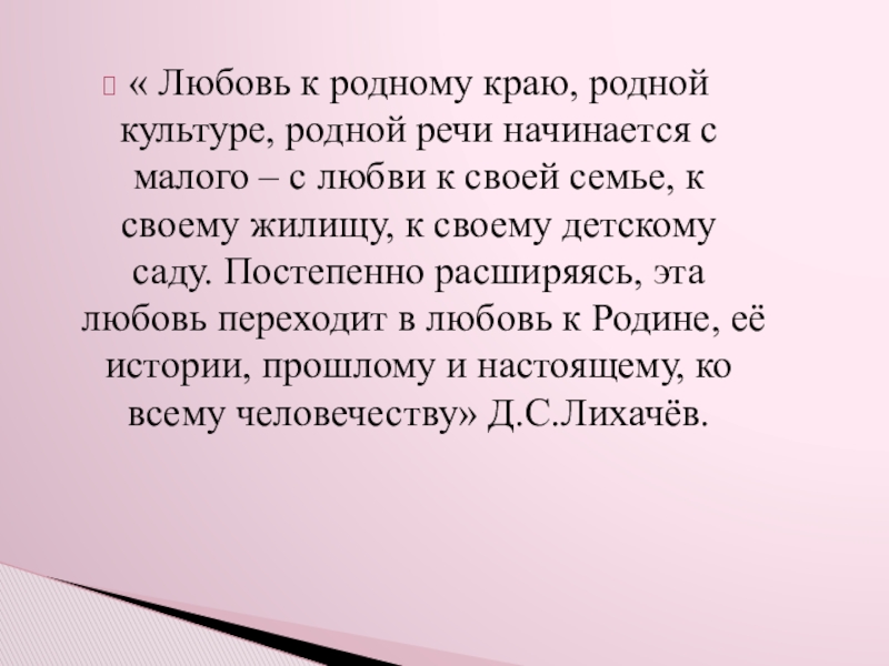 – с любви к своей семье, к своему жилищу, к своему детскому саду. Постепенно расширяясь, эта любовь переходит в любовь к Родине, её истории, прошлому и настоящему, ко всему человечеству» Д.С.Лихачёв.