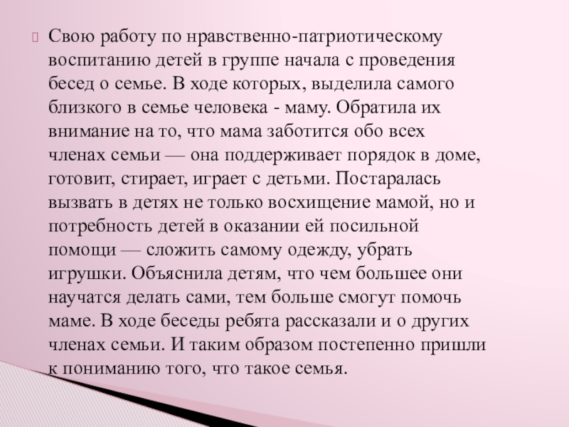 бесед о семье. В ходе которых, выделила самого близкого в семье человека - маму. Обратила их внимание на то, что мама заботится обо всех членах семьи — она поддерживает порядок в доме, готовит, стирает, играет с детьми. Постаралась вызвать в детях не только восхищение мамой, но и потребность детей в оказании ей посильной помощи — сложить самому одежду, убрать игрушки. Объяснила детям, что чем большее они научатся делать сами, тем больше смогут помочь маме. В ходе беседы ребята рассказали и о других членах семьи. И таким образом постепенно пришли к пониманию того, что такое семья.