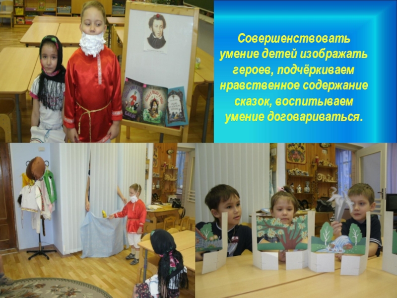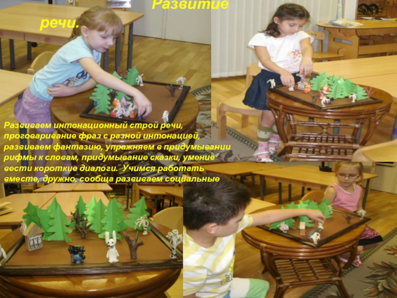 Развиваем интонационный строй речи, проговаривание фраз с разной интонацией, развиваем фантазию, упражняем в придумывании рифмы к словам, придумывание сказки, умение вести короткие диалоги. Учимся работать вместе, дружно, сообща развиваем социальные навыки общения.