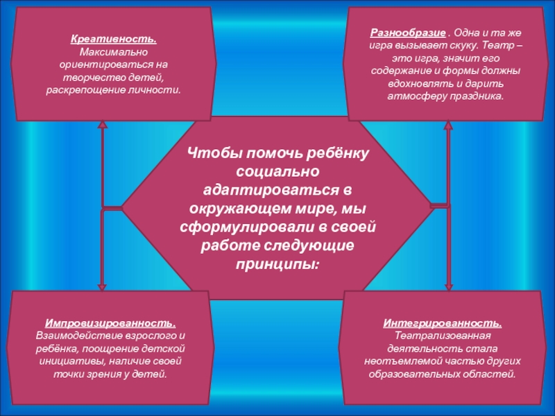 Креативность. Максимально ориентироваться на творчество детей, раскрепощение личности.