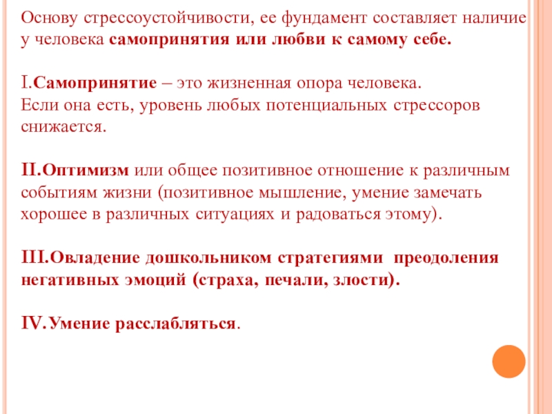 Слайд 5Основу стрессоустойчивости, ее фундамент составляет наличие у человека самопринятия или любви