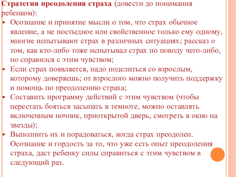 Слайд 12Стратегия преодоления страха (довести до понимания ребенком):