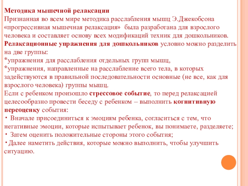 мышечная релаксация» была разработана для взрослого человека и составляет основу всех модификаций техник для дошкольников.