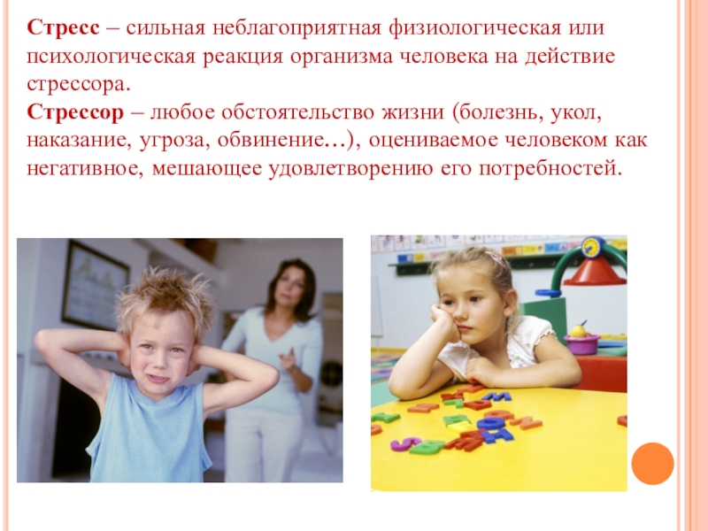 Стрессор – любое обстоятельство жизни (болезнь, укол, наказание, угроза, обвинение…), оцениваемое человеком как негативное, мешающее удовлетворению его потребностей.