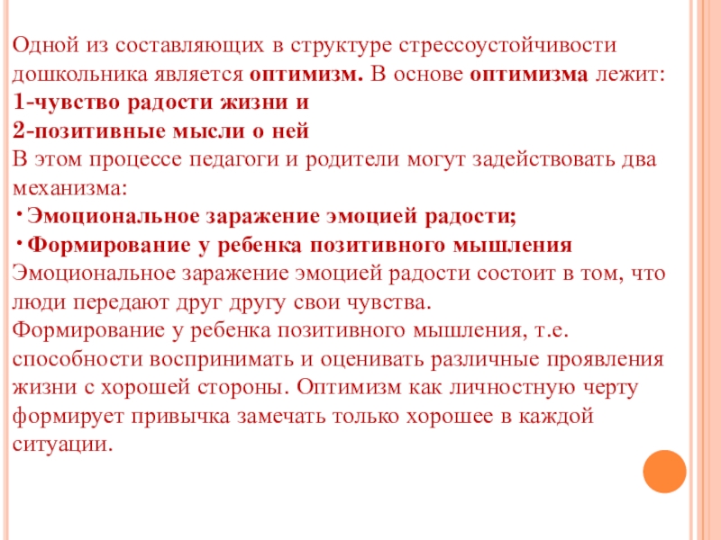 Слайд 11Одной из составляющих в структуре стрессоустойчивости дошкольника является оптимизм. В основе