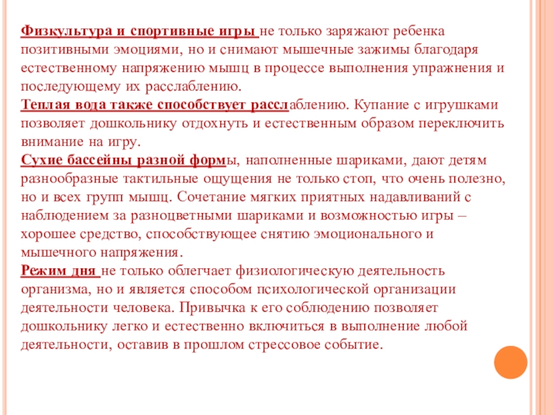 Режим дня не только облегчает физиологическую деятельность организма, но и является способом психологической организации деятельности человека. Привычка к его соблюдению позволяет дошкольнику легко и естественно включиться в выполнение любой деятельности, оставив в прошлом стрессовое событие.