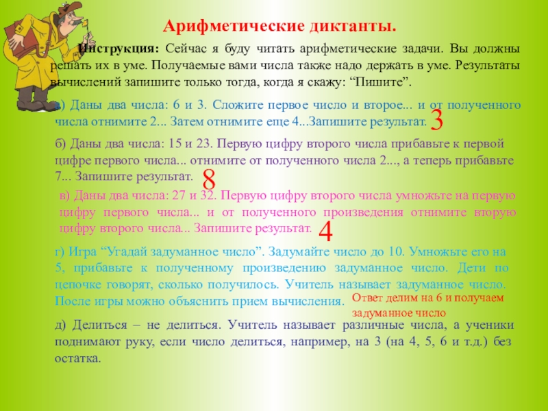 а) Даны два числа: 6 и 3. Сложите первое число и второе... и от полученного числа отнимите 2... Затем отнимите еще 4...Запишите результат.