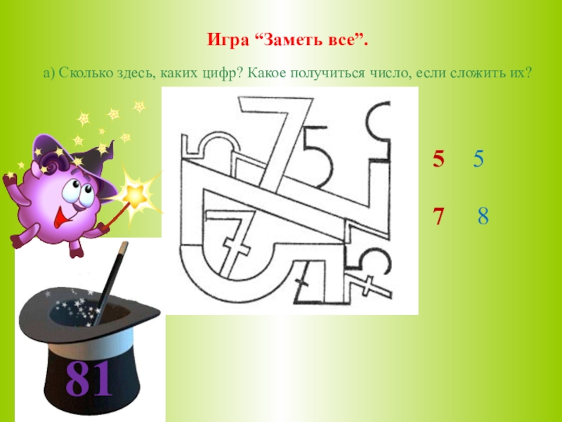 г) Игра “Угадай задуманное число”. Задумайте число до 10. Умножьте его на 5, прибавьте к полученному произведению задуманное число. Дети по цепочке говорят, сколько получилось. Учитель называет задуманное число. После игры можно объяснить прием вычисления.