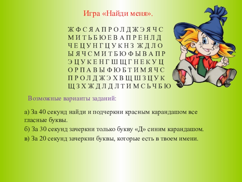 в) За 20 секунд зачеркни буквы, которые есть в твоем имени.