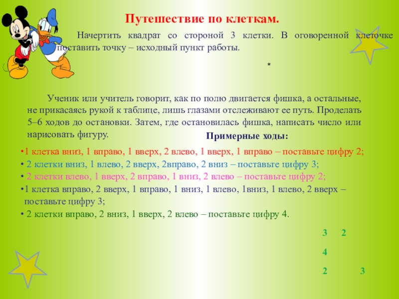 Ученик или учитель говорит, как по полю двигается фишка, а остальные, не прикасаясь рукой к таблице, лишь глазами отслеживают ее путь. Проделать 5–6 ходов до остановки. Затем, где остановилась фишка, написать число или нарисовать фигуру.