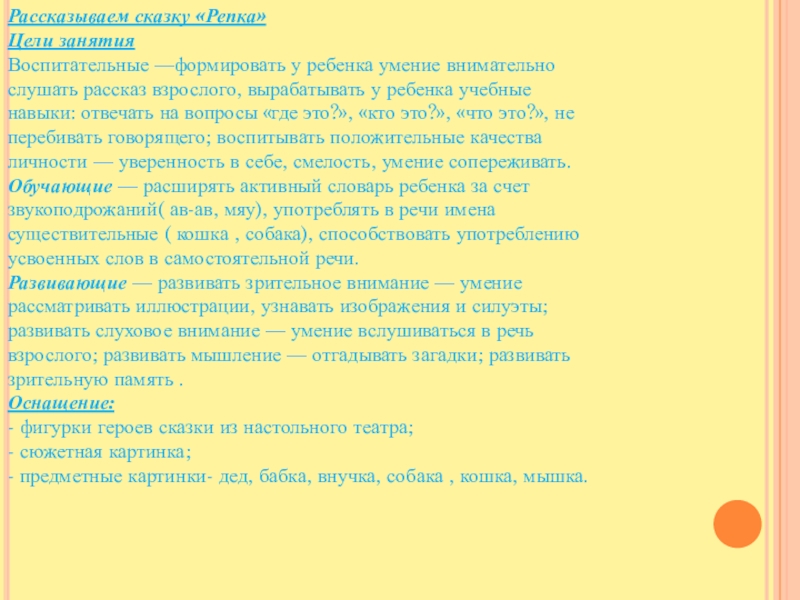Воспитательные —формировать у ребенка умение внимательно слушать рассказ