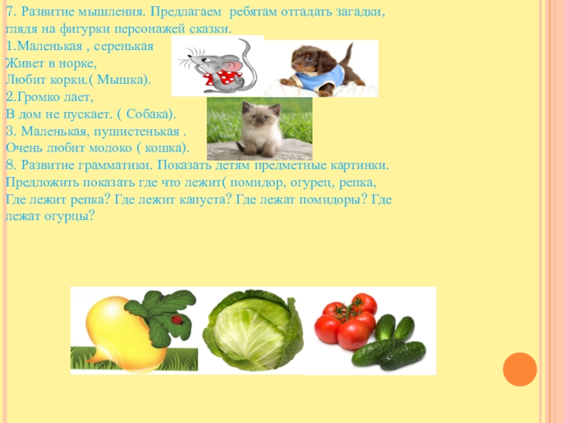 8. Развитие грамматики. Показать детям предметные картинки. Предложить показать где что лежит( помидор, огурец, репка,