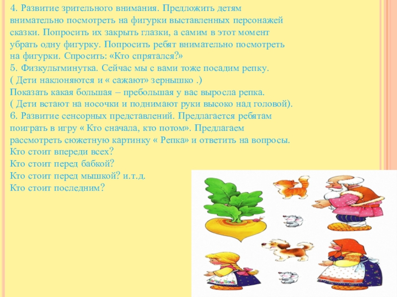 6. Развитие сенсорных представлений. Предлагается ребятам поиграть в игру « Кто сначала, кто потом». Предлагаем рассмотреть сюжетную картинку « Репка» и ответить на вопросы.