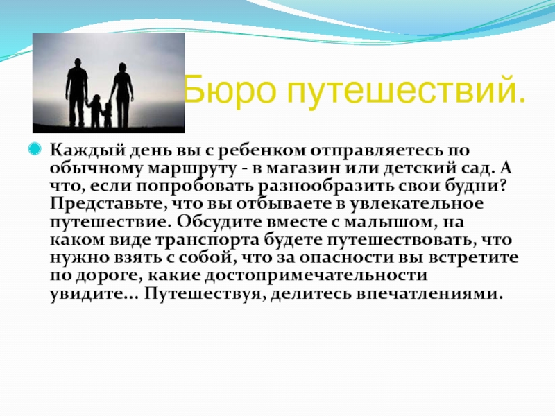 - в магазин или детский сад. А что, если попробовать разнообразить свои будни? Представьте, что вы отбываете в увлекательное путешествие. Обсудите вместе с малышом, на каком виде транспорта будете путешествовать, что нужно взять с собой, что за опасности вы встретите по дороге, какие достопримечательности увидите... Путешествуя, делитесь впечатлениями.
