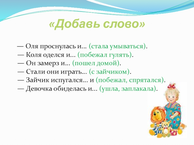 Закончи предложения. Мальчик пошел... Девочка ушла... Люди вышли... Я пришел... Саша идет медленно, а Вова идет... Можно сказать, что он не идет, а...