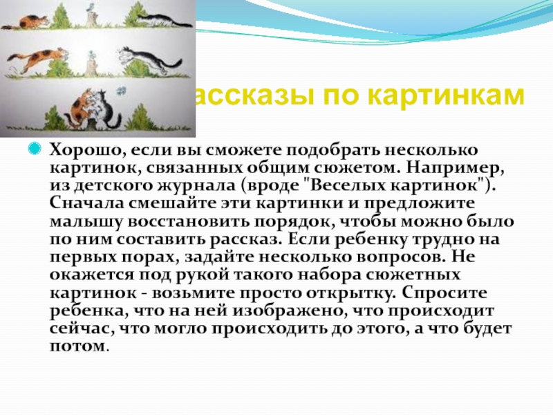 общим сюжетом. Например, из детского журнала (вроде "Веселых картинок"). Сначала смешайте эти картинки и предложите малышу восстановить порядок, чтобы можно было по ним составить рассказ. Если ребенку трудно на первых порах, задайте несколько вопросов. Не окажется под рукой такого набора сюжетных картинок - возьмите просто открытку. Спросите ребенка, что на ней изображено, что происходит сейчас, что могло происходить до этого, а что будет потом.