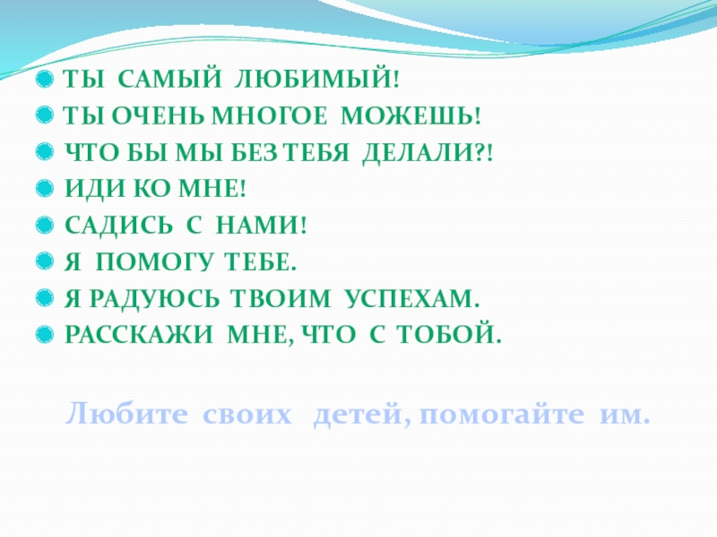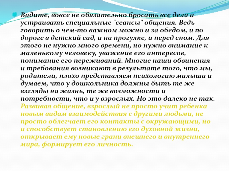общения. Ведь говорить о чем-то важном можно и за обедом, и по дороге в детский сад, и на прогулке, и перед сном. Для этого не нужно много времени, но нужно внимание к маленькому человеку, уважение его интересов, понимание его переживаний. Многие наши обвинения и требования возникают в результате того, что мы, родители, плохо представляем психологию малыша и думаем, что у дошкольника должны быть те же взгляды на жизнь, те же возможности и потребности, что и у взрослых. Но это далеко не так. Развивая общение, взрослый не просто учит ребенка новым видам взаимодействия с другими людьми, не просто облегчает его контакты с окружающими, но и способствует становлению его духовной жизни, открывает ему новые грани внешнего и внутреннего мира, формирует его личность.