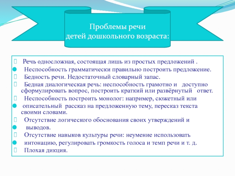 Бедная диалогическая речь: неспособность грамотно и доступно сформулировать вопрос, построить краткий или развёрнутый ответ.