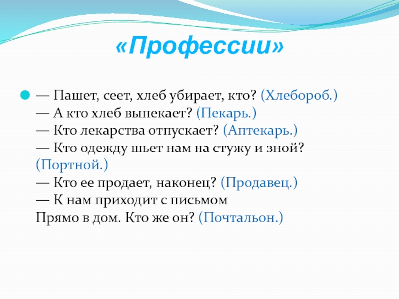 — Пашет, сеет, хлеб убирает, кто? (Хлебороб.)