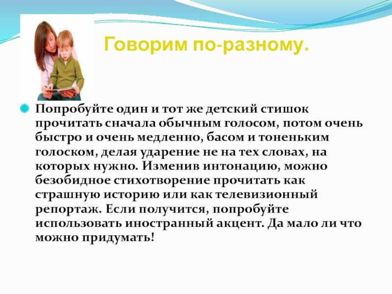 Попробуйте один и тот же детский стишок прочитать сначала обычным голосом, потом очень быстро и очень медленно, басом и тоненьким голоском, делая ударение не на тех словах, на которых нужно. Изменив интонацию, можно безобидное стихотворение прочитать как страшную историю или как телевизионный репортаж. Если получится, попробуйте использовать иностранный акцент. Да мало ли что можно придумать!