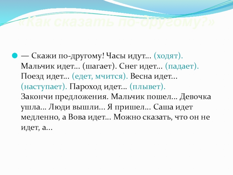 Снег идет... (падает). Поезд идет... (едет, мчится). Весна идет... (наступает). Пароход идет... (плывет).