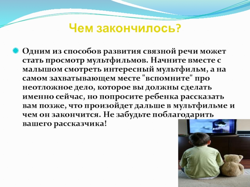 вместе с малышом смотреть интересный мультфильм, а на самом захватывающем месте "вспомните" про неотложное дело, которое вы должны сделать именно сейчас, но попросите ребенка рассказать вам позже, что произойдет дальше в мультфильме и чем он закончится. Не забудьте поблагодарить вашего рассказчика!