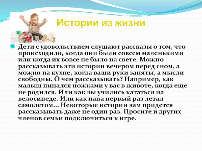 когда они были совсем маленькими или когда их вовсе не было на свете. Можно рассказывать эти истории вечером перед сном, а можно на кухне, когда ваши руки заняты, а мысли свободны. О чем рассказывать? Например, как малыш пинался ножками у вас в животе, когда еще не родился. Или как вы учились кататься на велосипеде. Или как папа первый раз летал самолетом... Некоторые истории вам придется рассказывать даже не один раз. Просите и других членов семьи подключиться к игре.