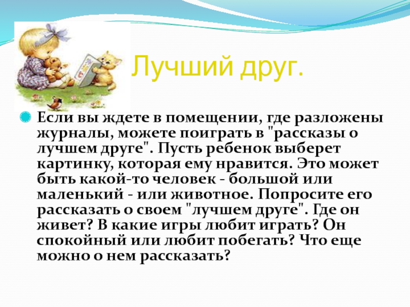 можете поиграть в "рассказы о лучшем друге". Пусть ребенок выберет картинку, которая ему нравится. Это может быть какой-то человек - большой или маленький - или животное. Попросите его рассказать о своем "лучшем друге". Где он живет? В какие игры любит играть? Он спокойный или любит побегать? Что еще можно о нем рассказать?