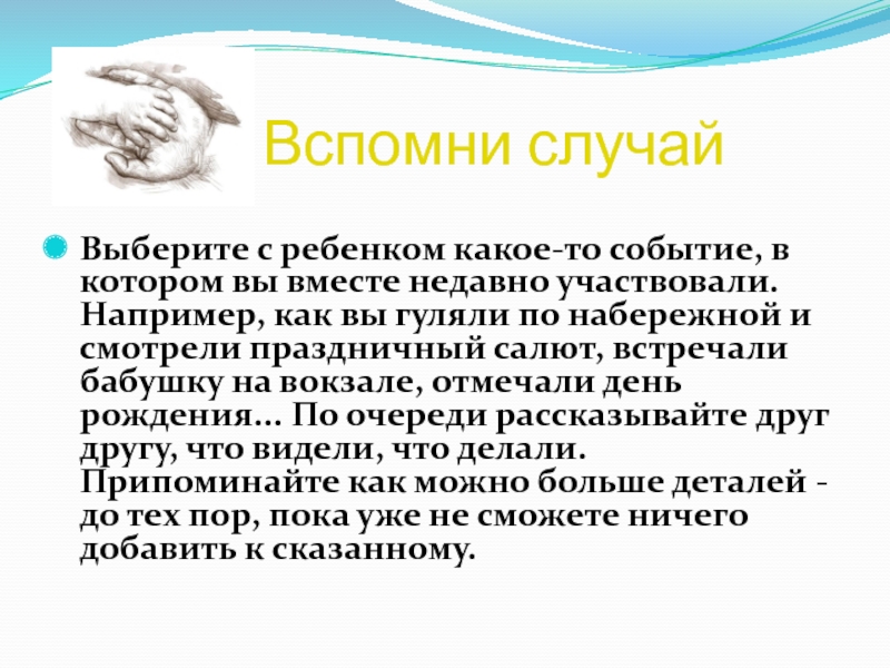 котором вы вместе недавно участвовали. Например, как вы гуляли по набережной и смотрели праздничный салют, встречали бабушку на вокзале, отмечали день рождения... По очереди рассказывайте друг другу, что видели, что делали. Припоминайте как можно больше деталей - до тех пор, пока уже не сможете ничего добавить к сказанному.