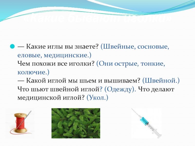 — Какие иглы вы знаете? (Швейные, сосновые, еловые, медицинские.)