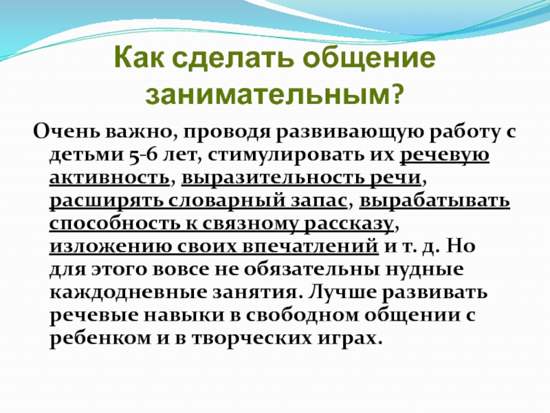 лет, стимулировать их речевую активность, выразительность речи, расширять словарный запас, вырабатывать способность к связному рассказу, изложению своих впечатлений и т. д. Но для этого вовсе не обязательны нудные каждодневные занятия. Лучше развивать речевые навыки в свободном общении с ребенком и в творческих играх.