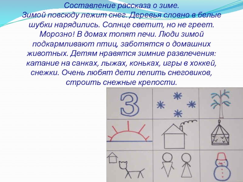 шубки нарядились. Солнце светит, но не греет. Морозно! В домах топят печи. Люди зимой подкармливают птиц, заботятся о домашних животных. Детям нравятся зимние развлечения: катание на санках, лыжах, коньках, игры в хоккей, снежки. Очень любят дети лепить снеговиков, строить снежные крепости.