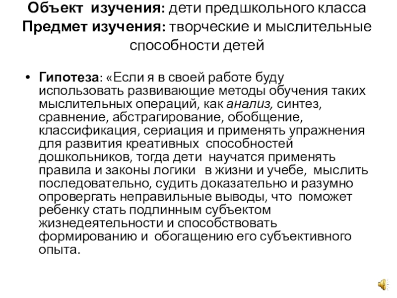 «Если я в своей работе буду использовать развивающие методы обучения таких мыслительных операций, как анализ, синтез, сравнение, абстрагирование, обобщение, классификация, сериация и применять упражнения для развития креативных способностей дошкольников, тогда дети научатся применять правила и законы логики в жизни и учебе, мыслить последовательно, судить доказательно и разумно опровергать неправильные выводы, что поможет ребенку стать подлинным субъектом жизнедеятельности и способствовать формированию и обогащению его субъективного опыта.