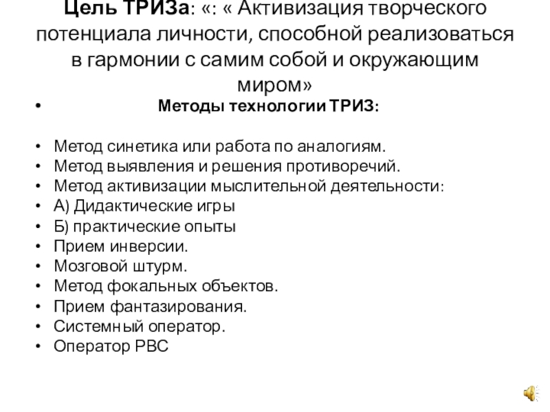 Цель ТРИЗа: «: « Активизация творческого потенциала личности, способной реализоваться в