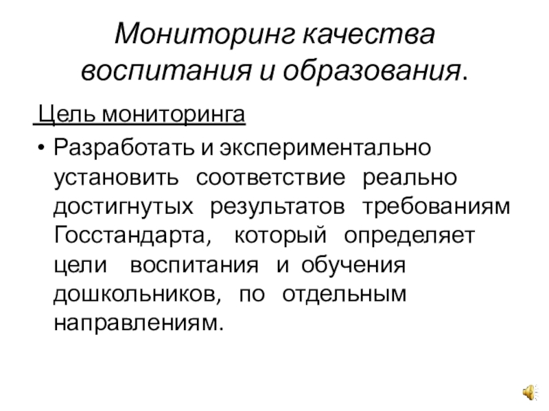 соответствие реально достигнутых результатов требованиям Госстандарта, который определяет цели воспитания и обучения дошкольников, по отдельным направлениям.