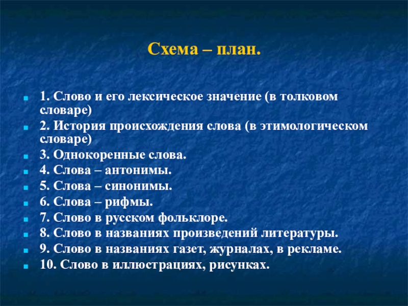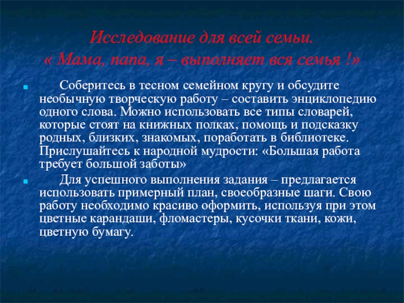 Соберитесь в тесном семейном кругу и обсудите необычную творческую работу – составить энциклопедию одного слова. Можно использовать все типы словарей, которые стоят на книжных полках, помощь и подсказку родных, близких, знакомых, поработать в библиотеке. Прислушайтесь к народной мудрости: «Большая работа требует большой заботы»