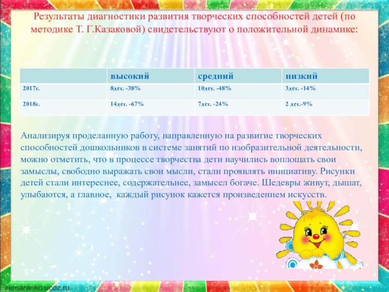 Анализируя проделанную работу, направленную на развитие творческих способностей дошкольников в системе занятий по изобразительной деятельности, можно отметить, что в процессе творчества дети научились воплощать свои замыслы, свободно выражать свои мысли, стали проявлять инициативу. Рисунки детей стали интереснее, содержательнее, замысел богаче. Шедевры живут, дышат, улыбаются, а главное, каждый рисунок кажется произведением искусств.