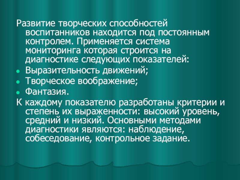 Слайд 17Развитие творческих способностей воспитанников находится под постоянным контролем. Применяется система мониторинга