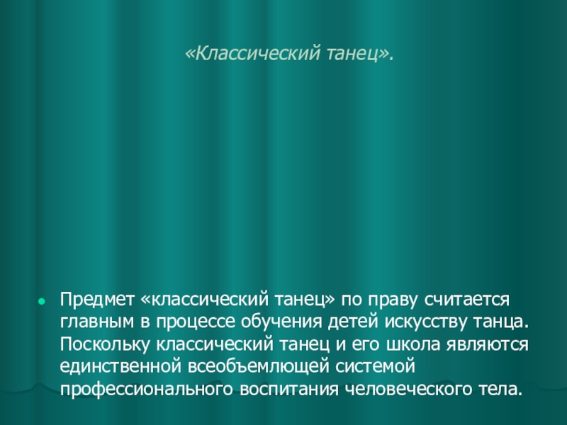 детей искусству танца. Поскольку классический танец и его школа являются единственной всеобъемлющей системой профессионального воспитания человеческого тела.