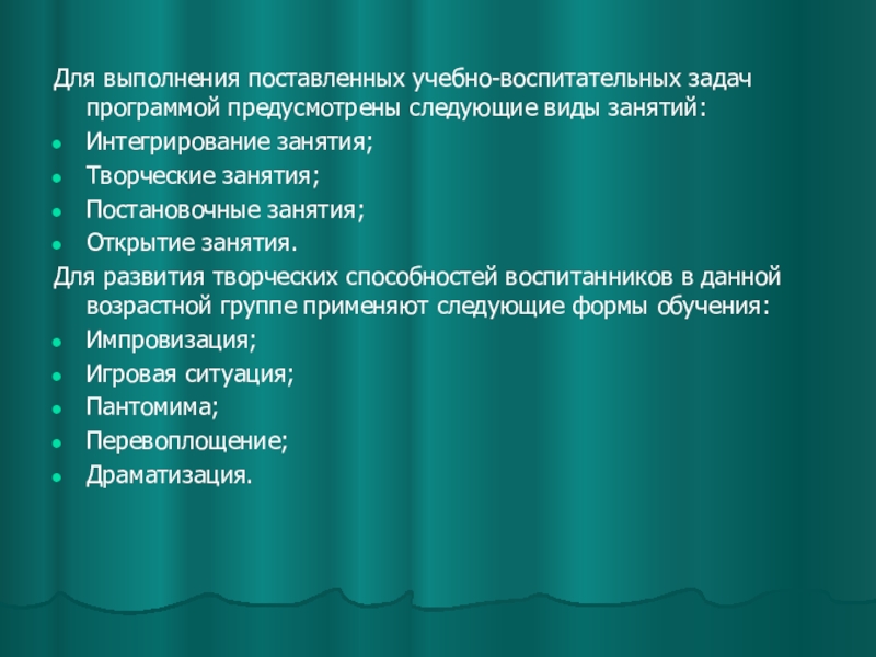 Слайд 15Для выполнения поставленных учебно-воспитательных задач программой предусмотрены следующие виды занятий:
