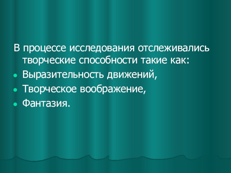 Слайд 8В процессе исследования отслеживались творческие способности такие как:
