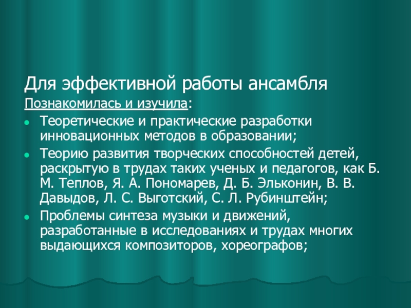Теорию развития творческих способностей детей, раскрытую в трудах таких ученых и педагогов, как Б. М. Теплов, Я. А. Пономарев, Д. Б. Эльконин, В. В. Давыдов, Л. С. Выготский, С. Л. Рубинштейн;