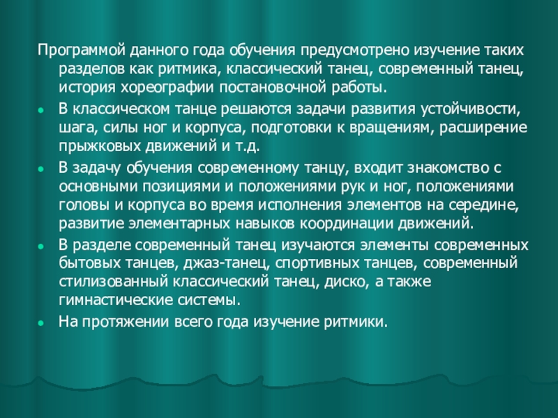 Слайд 13Программой данного года обучения предусмотрено изучение таких разделов как ритмика, классический