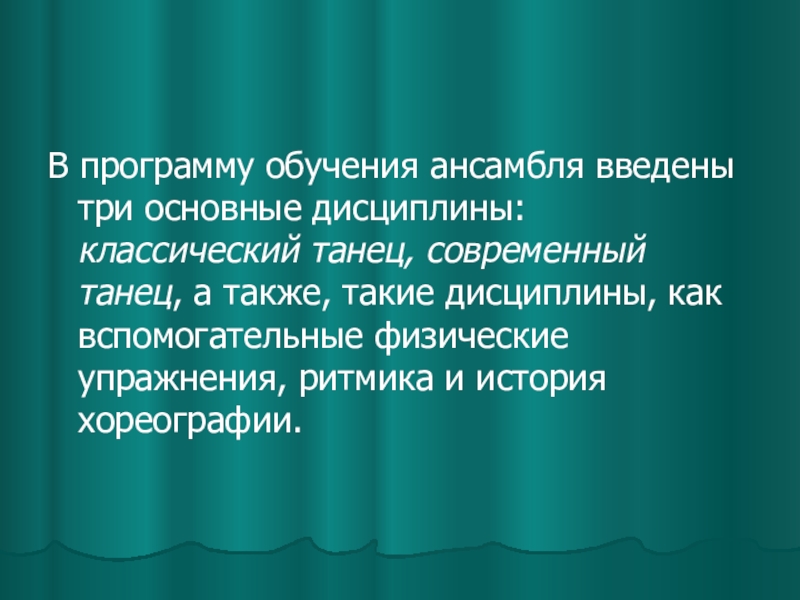 Слайд 9В программу обучения ансамбля введены три основные дисциплины: классический танец, современный