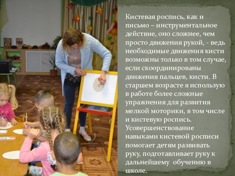 просто движения рукой, - ведь необходимые движения кисти возможны только в том случае, если скоординированы движения пальцев, кисти. В старшем возрасте я использую в работе более сложные упражнения для развития мелкой моторики, в том числе и кистевую роспись. Усовершенствование навыками кистевой росписи помогает детям развивать руку, подготавливает руку к дальнейшему обучению в школе.