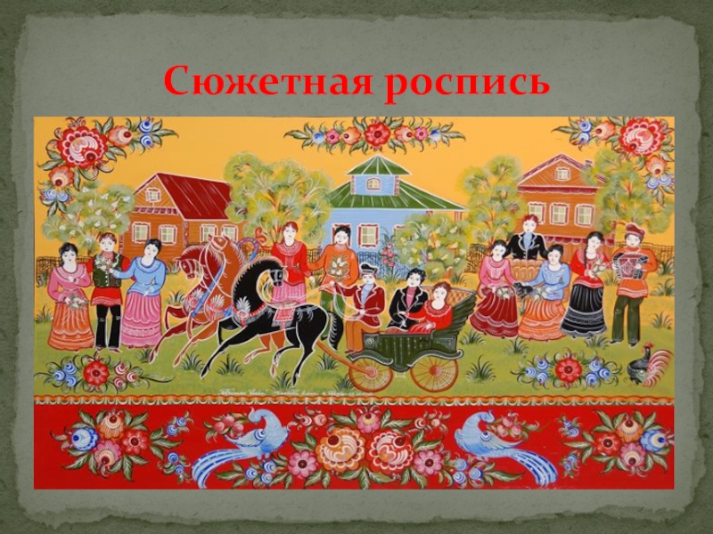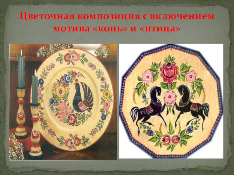 Слайд 13Цветочная композиция с включением мотива «конь» и «птица»